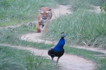 Fnd, रामनगर: उत्तराखंड के नैनीताल जिले में स्थित विश्व प्रसिद्ध कॉर्बेट नेशनल पार्क से एक बेहद दुर्लभ वीडियो सामने आया है. इस वीडियो में राष्ट्रीय पशु बाघ और राष्ट्रीय पक्षी मोर एक साथ एक ही फ्रे...